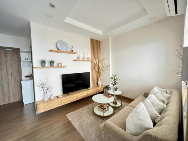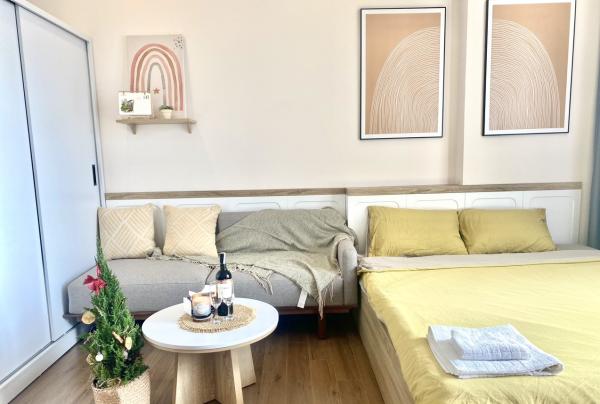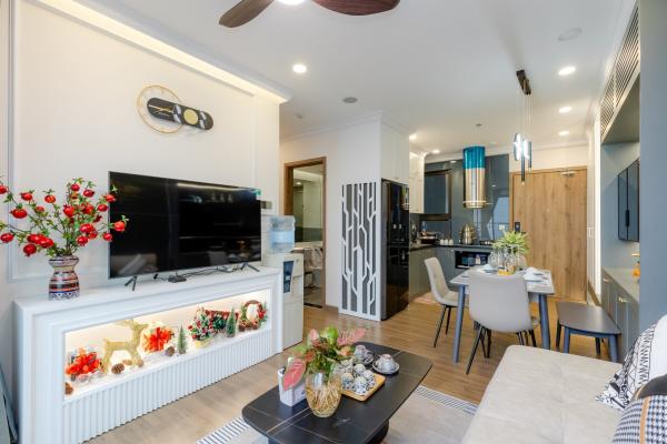 Căn hộ được trang bị đầy đủ đồ dùng cho gia đình bao gồm: tivi, tủ lạnh, máy giặt, đồ nấu ăn kèm gia vị cơ bản,